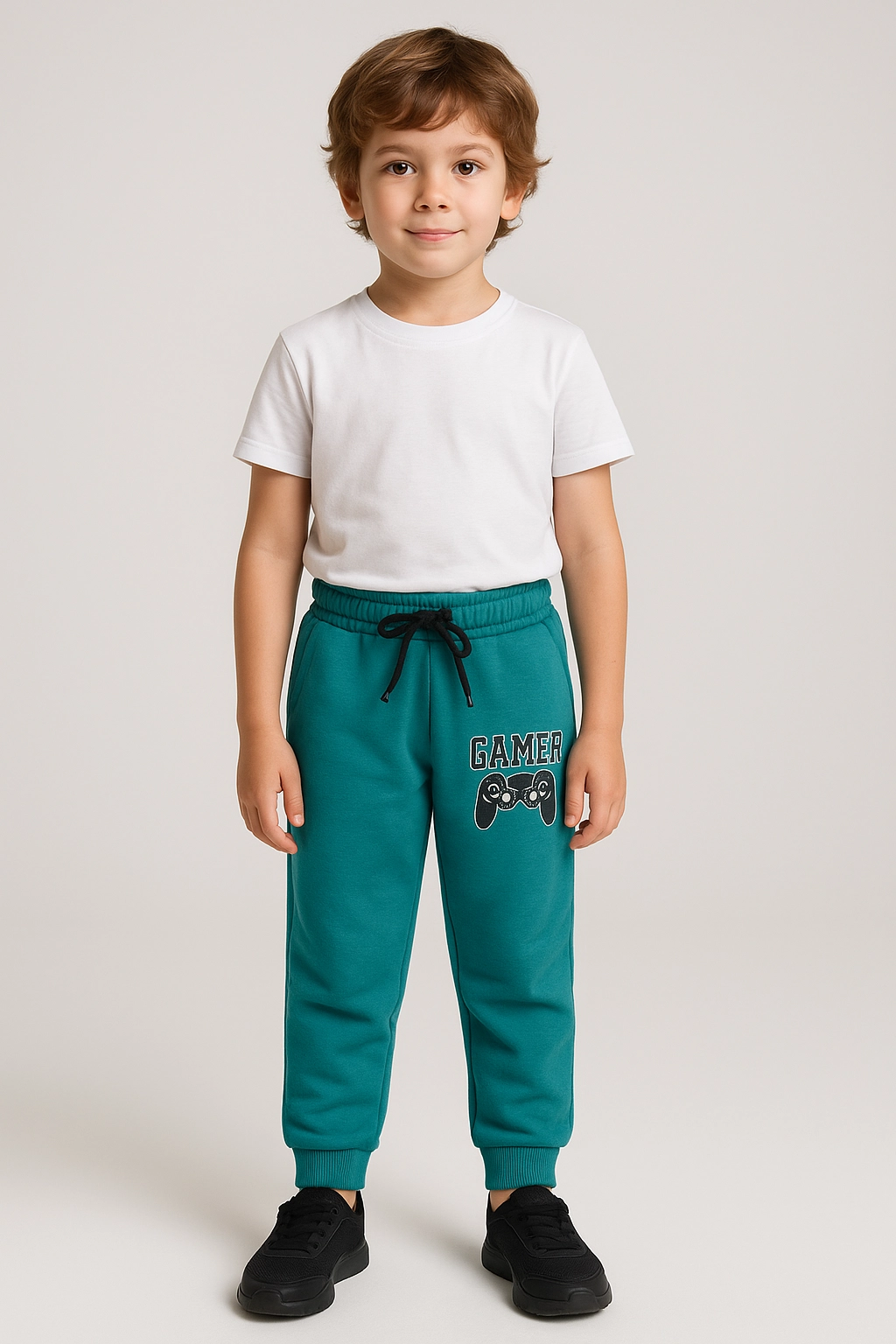 Tyrkysové tepláky z měkké bavlny s potiskem „GAMER“ a herním ovladačem. Elastický pas se stahovací šňůrkou, boční kapsy a žebrované lemy na nohavicích. Ideální pro pohodlné a stylové nošení malých fanoušků videoher. celý popis