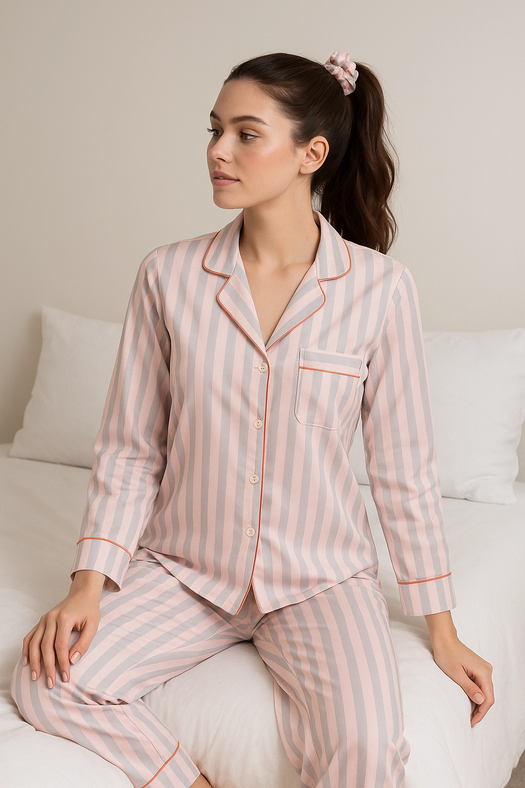 Tato pyžama má elegantní a jemný design s vertikálními pruhy v světle růžové a šedé barvě. Je vyrobena z měkkého a pohodlného materiálu, ideálního pro klidný spánek. Horní díl má klasický střih s límcem, zapínáním na knoflíky a náprsní kapsou ozdobenou kontrastní lemovkou. Kalhoty mají elastický pas pro větší pohodlí a jsou rovně střižené. Celý set doplňuje gumička do vlasů ze stejné látky.