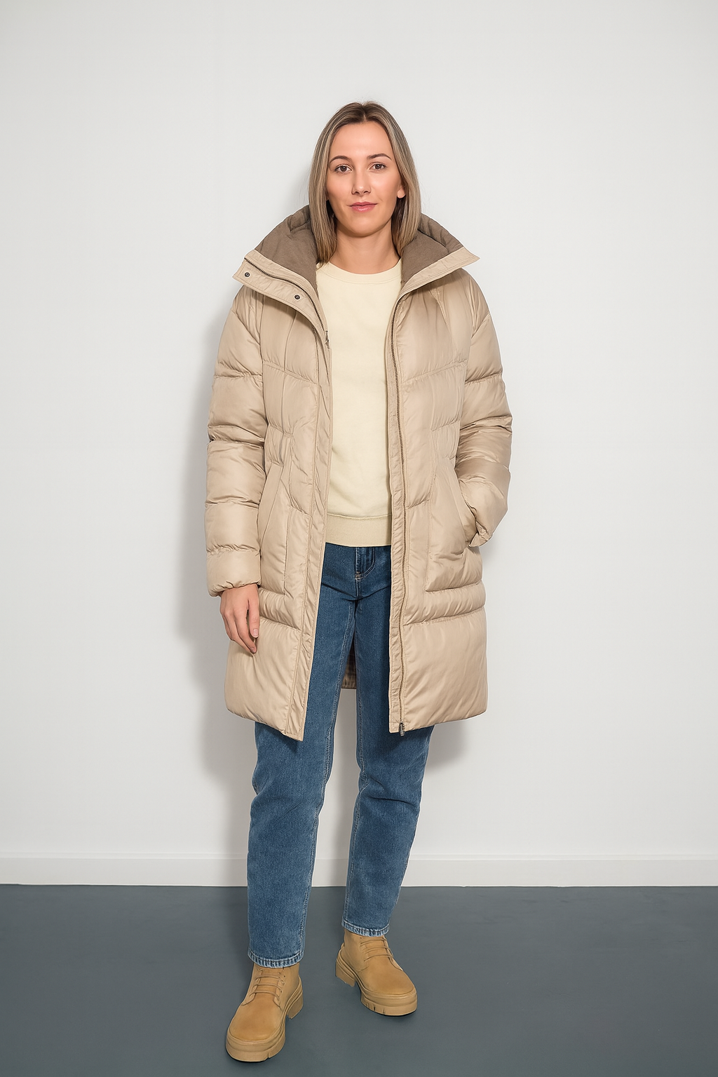 Dámská zimní bunda dlouha se zipem.Bunda je vybavena také s odnímatelnou kapucí a dvě kapsy po stranách.