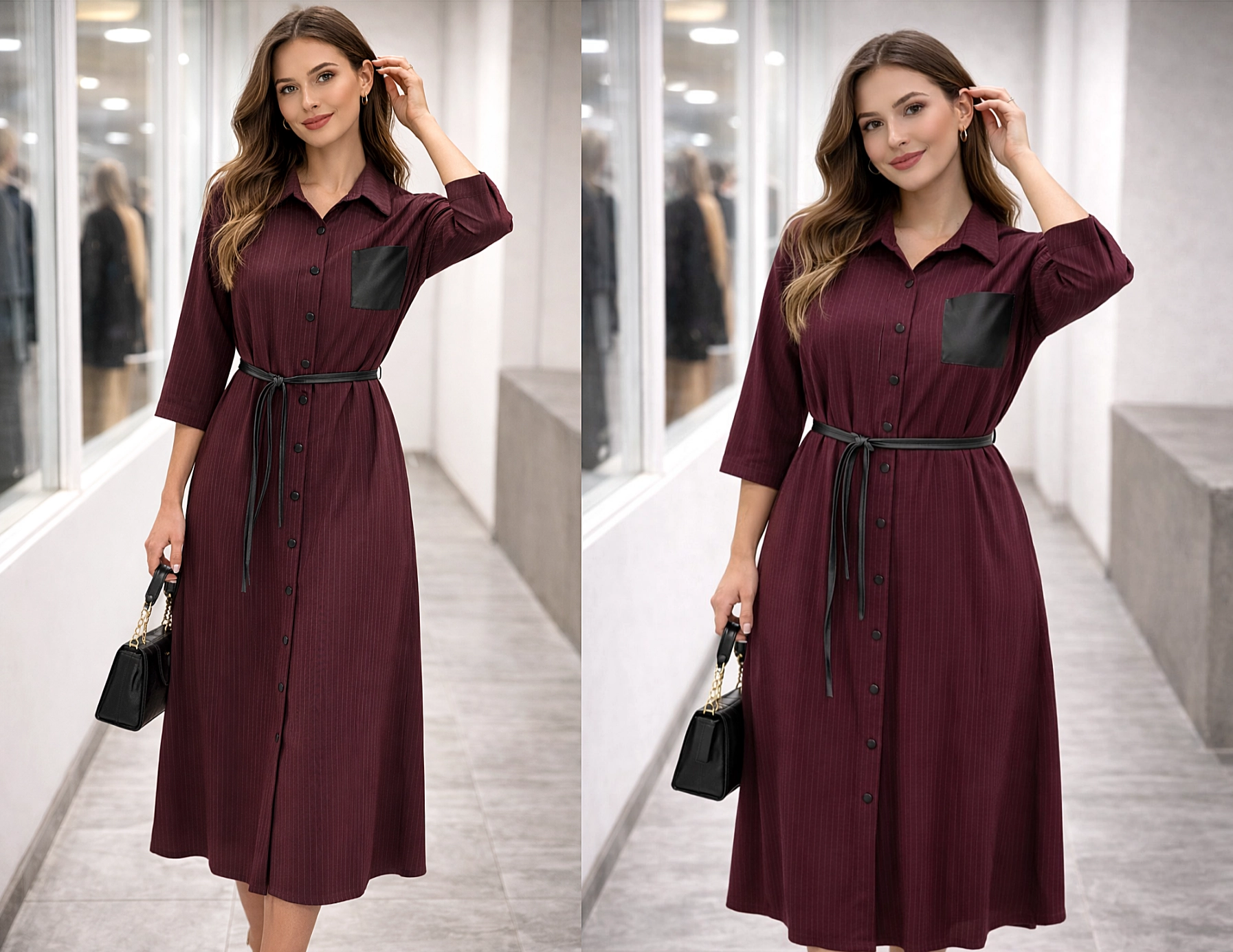 Tmavě vínové košilové šaty s knoflíky po celé délce a tříčtvrtečními rukávy. Mají jemný proužkovaný vzor, černou náprsní kapsu a úzký pásek v pase, který zvýrazňuje siluetu. Elegantní a vhodné jak do práce, tak na společenské příležitosti. celý popis