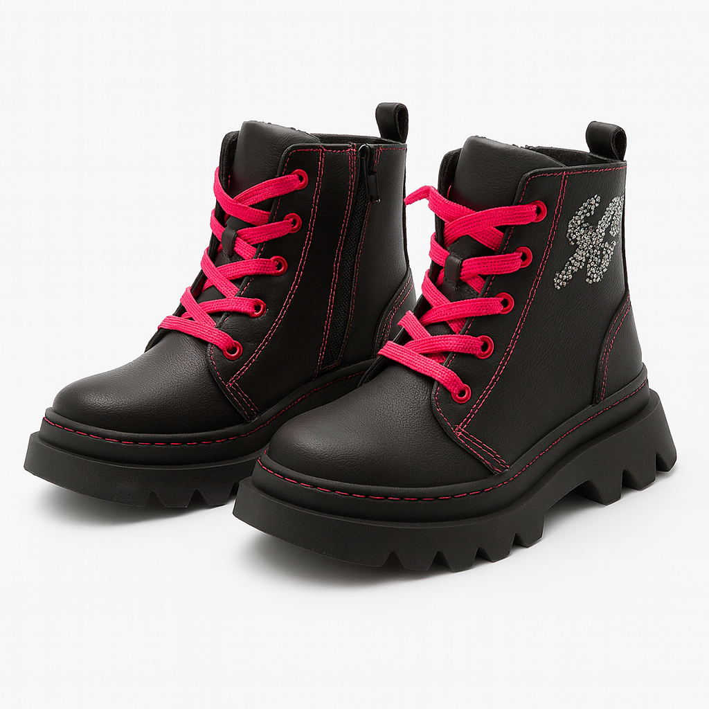 Dívčí ortopedické zimní boty z kvalitní ekologické kůže. Mají silnou, ale pružnou podrážku, která poskytuje stabilitu a pohodlí při chůzi. Moderní design – černá barva s růžovými detaily a výraznými tkaničkami – se skvěle hodí pro zimní období. Boční zip umožňuje snadné obouvání a zouvání. celý popis