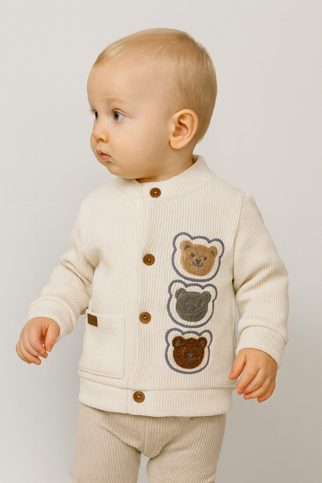 Roztomilá mikina pro miminka v krémové barvě s knoflíky a třemi vyšívanými medvídky na přední straně. Pohodlná, měkká a ideální pro každodenní nošení. celý popis